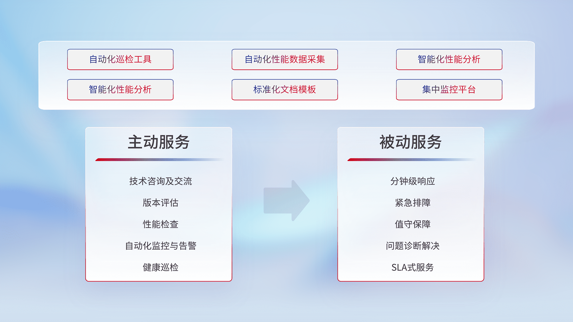 智能化工具和标准化文档,,,保障服务质量,,提供主动服务(包含技术咨询、、、、版本评估、、性能检查、、、自动化监控与告警、、健康巡检)和被动服务包含(分钟级响应、、紧急排障、、、值守保障、、、问题诊断解决、、、SLA服务)。。。